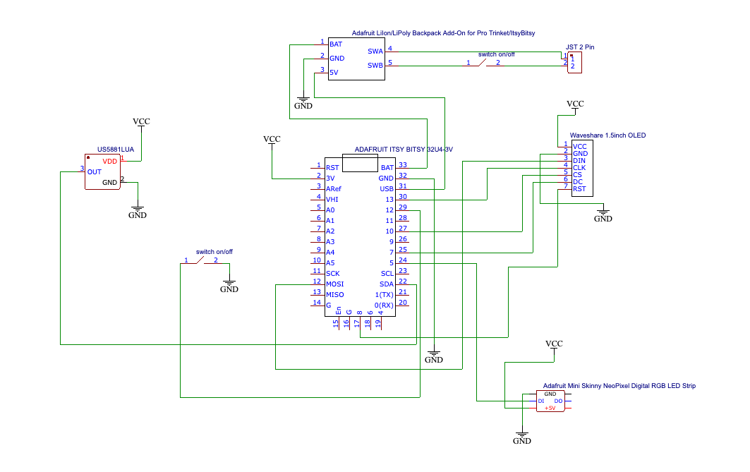 - NeoPixel Strip: Data pin 5, power through battery backpack